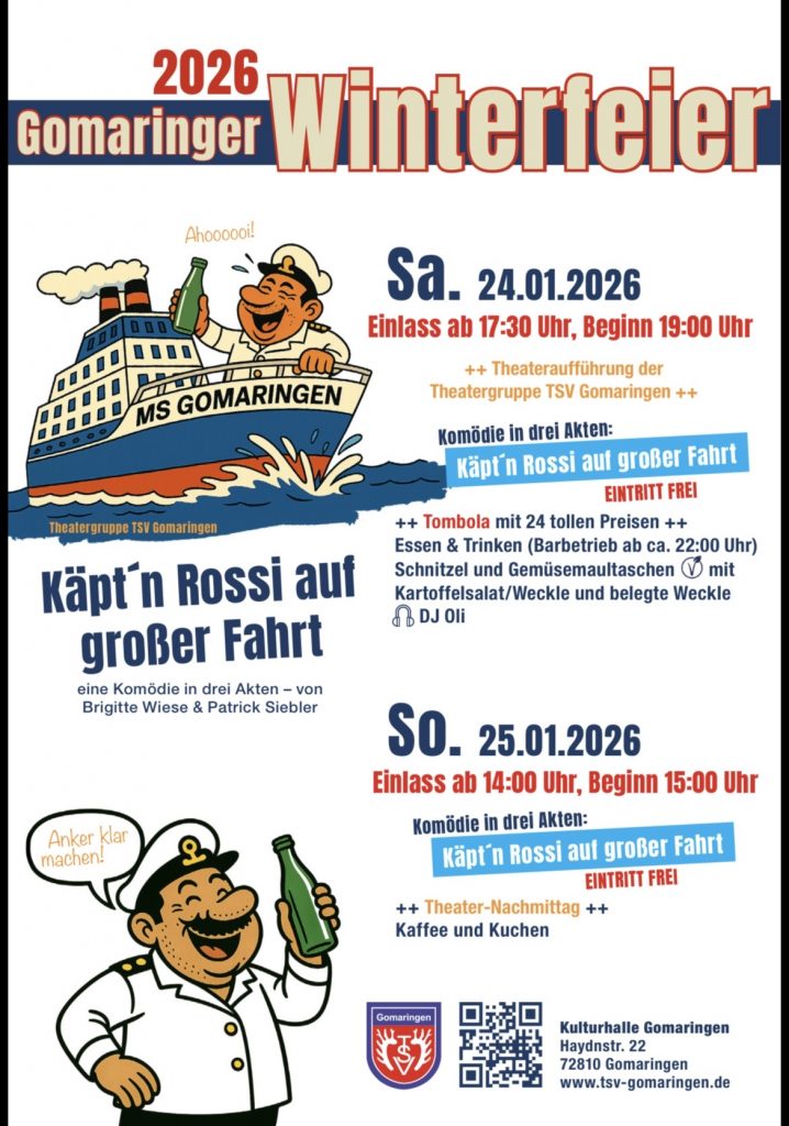Am Sonntag, den 21.01.2024 findet der TSV-Theaternachmittag mit Kuchen und Kaffee statt. Hier habt ihr die Chance, bei gemütlicher Atmosphäre, die Komödie erneut Euch anzuschauen. Einlass in die Kulturhalle ist ab 14 Uhr. Die Theateraufführung startet um 15 Uhr.